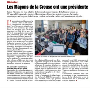 - La Montagne Creuse : 16/04/2026 – Histoire : Les Maçons de la Creuse ont une présidente – Renée Nicoux a été élue à la tête de l’association des Maçons de la Creuse lors de la 30e assemblée générale réunie à Maisonnisses. Parmi les projets porteurs, l’annuaire numérique des Maçons de la Creuse, outil de recherche collaboratif, continue de s’étoffer….