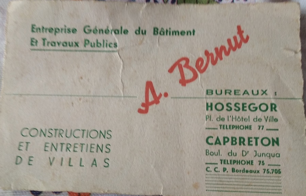 BERNUT Léon "Auguste" Etienne Maçon et entrepreneur BTP Cuzion (Indre) 13/07/1888 Hossegor (Landes) 15/01/1961